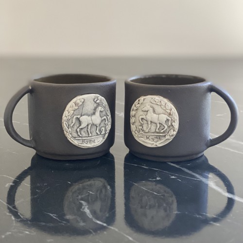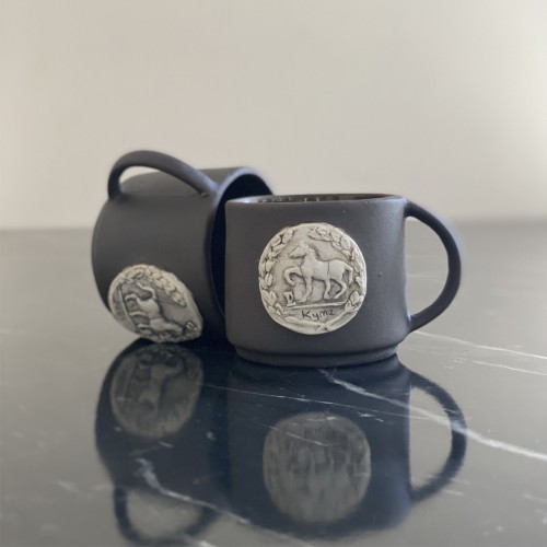 Üzerinde Kyme Antik Kentinden çıkmış bir sikkenin figürü eklenmiş kupa tasarımıdır.